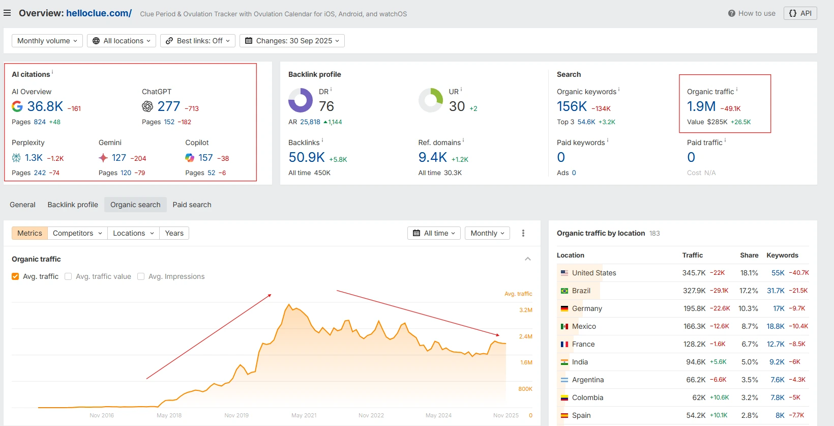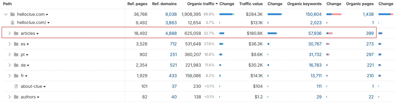 Clue’s site also relies on one main content pillar: Articles, which accounts for 33% of all organic traffic. This is their version of an educational mega-hub, containing a wide range of sub-categories. The Articles hub is strong, but the rest of their visibility comes from localization, not their primary English site.