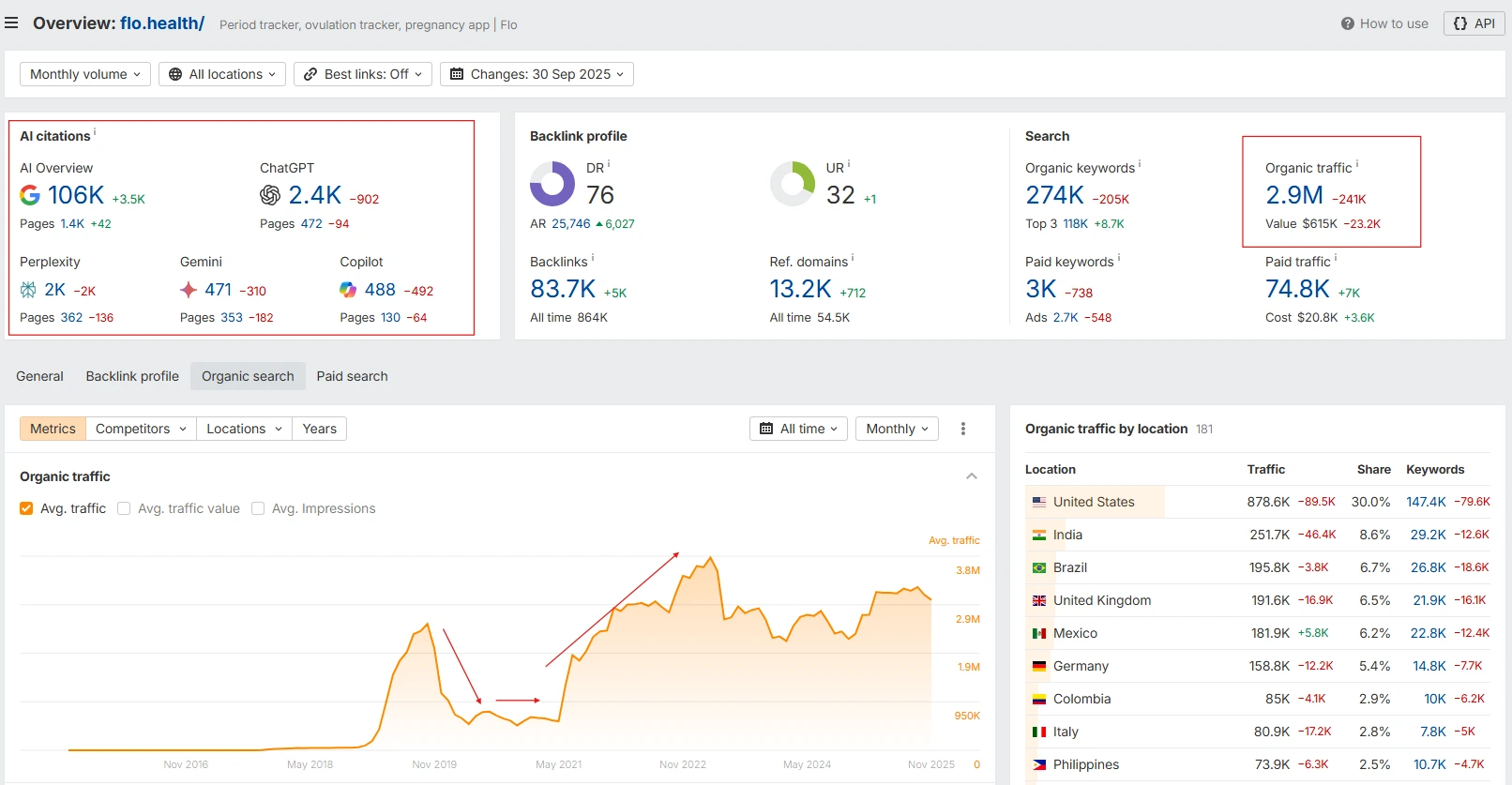 Flo experienced a noticeable decline in organic traffic during this period. Drops like this can happen for many reasons: site changes, content restructuring, technical issues, increased competition, or major industry shifts.