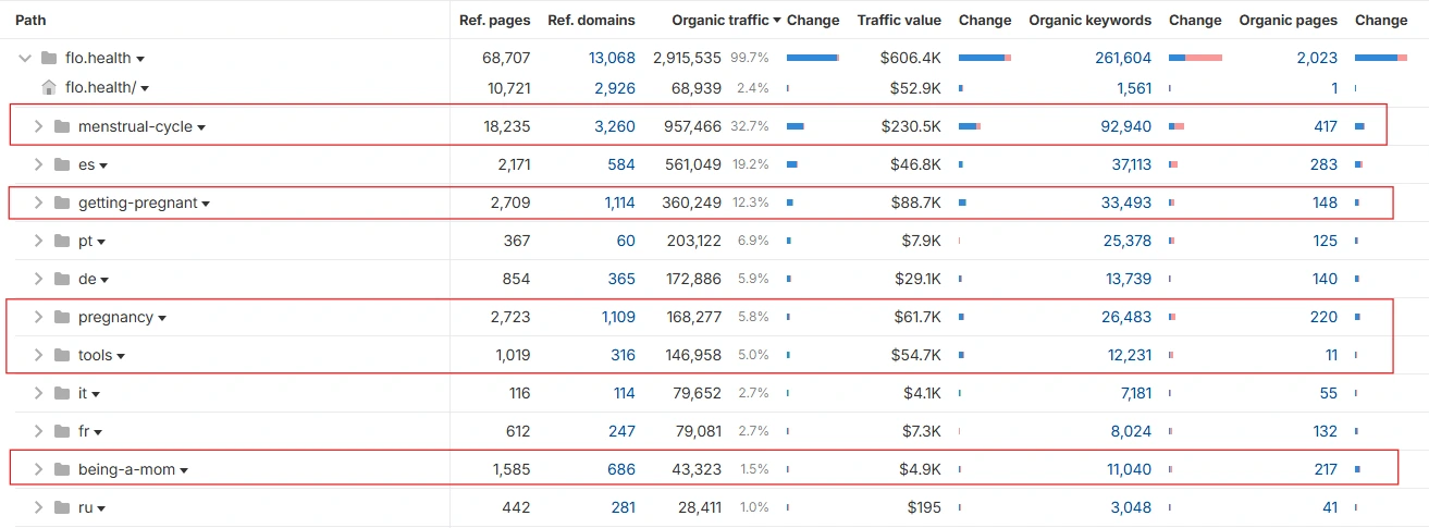 Flo attracts 2.9M monthly organic visitors, making it one of the strongest visibility engines in the femtech market. Their content aligns extremely well with what women search for online.