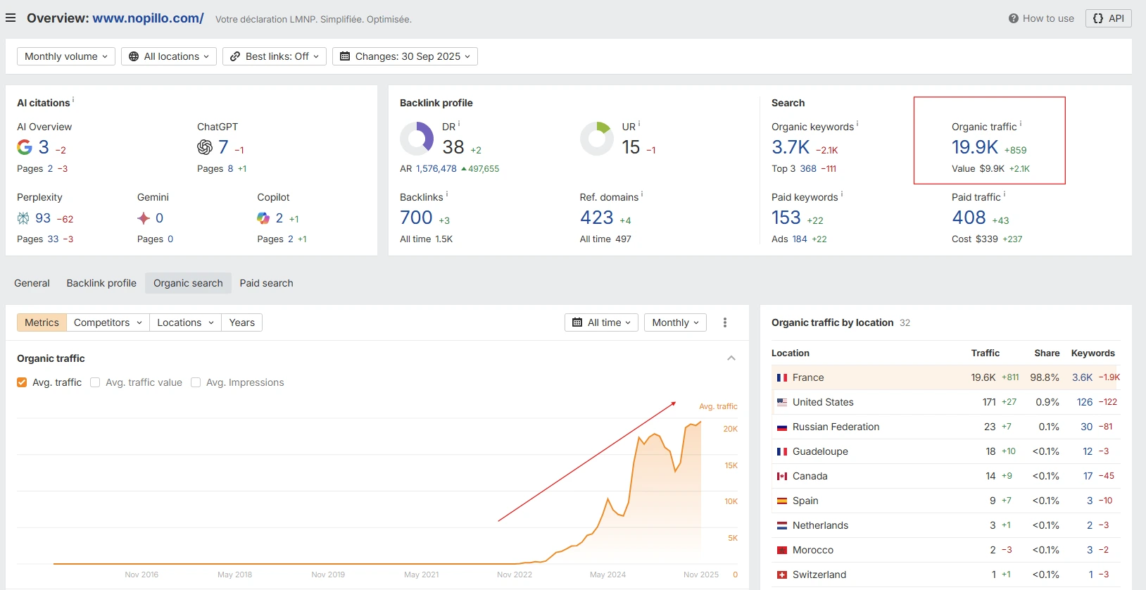 When I started working with Nopillo, they already had some visibility, but it was scattered and unoptimized. Competitors with focused SEO strategies were capturing the majority of qualified traffic.